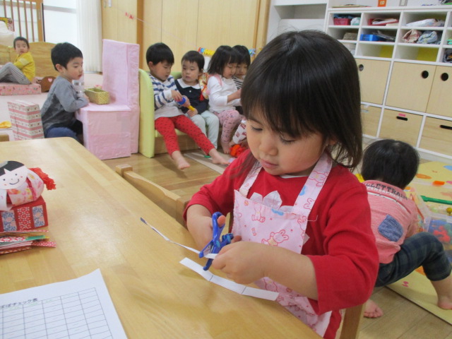 2歳児たんぽぽ組では、初めてのはさみに挑戦です。少人数に分かれ、職員と一緒に行いました。様々な千代紙を真っ直ぐ切るのも一苦労。はさみの先、折り紙とにらめっこです。チョキチョキはさみが進み、切れると嬉しそう。可愛い十二単着物のおひな様ができるかなぁ?
