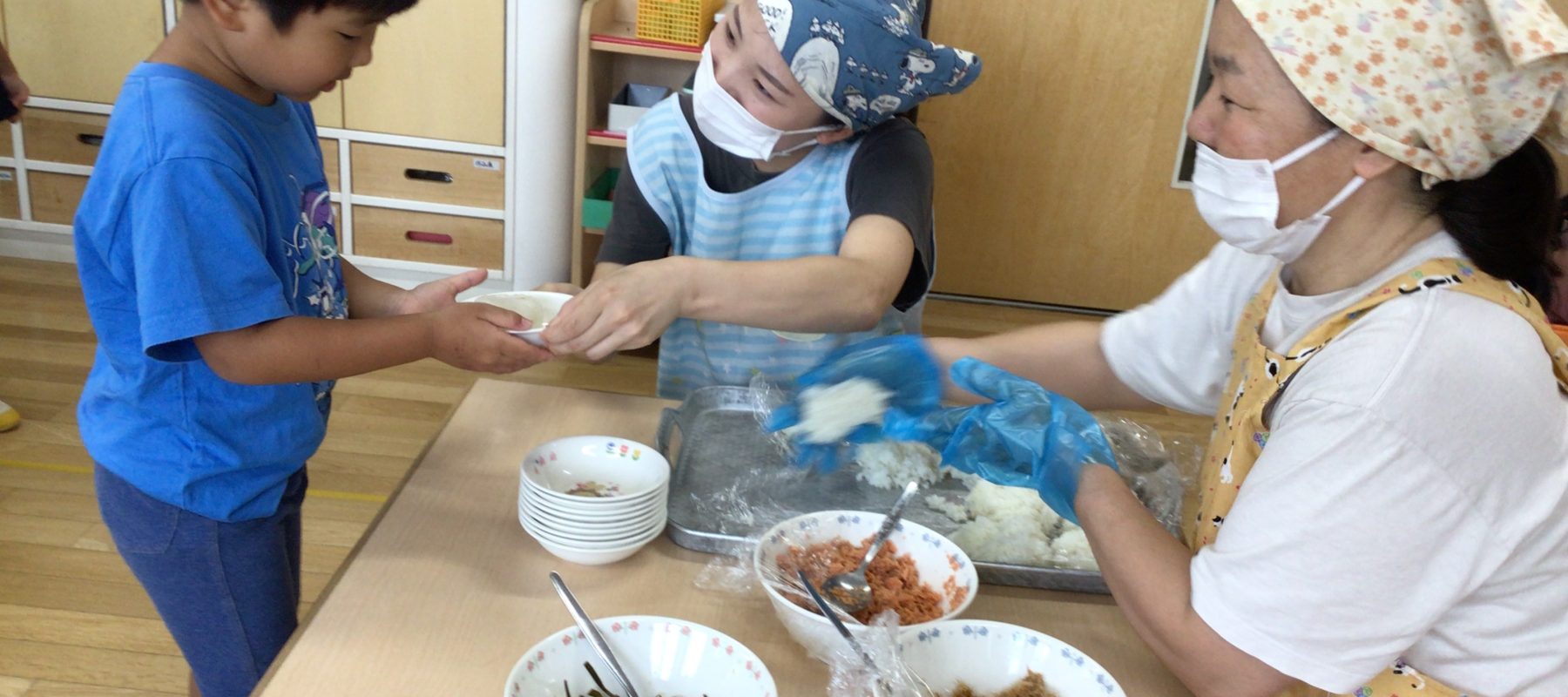 今日は、おにぎり屋さんがクラスにやってきました。なんと!!鮭、昆布、おかかの中から好きな具材を選び、きゅっきゅっと握ってもらいました。「ん~…」と真剣に悩み、やっと一種類を選ぶ子どももいれば、「おかか!!」と“おにぎりと言ったら…”というように即決の子どももいました。自分で握るおにぎりがまたおいしく、満面の笑みを浮かべながら食べていました。