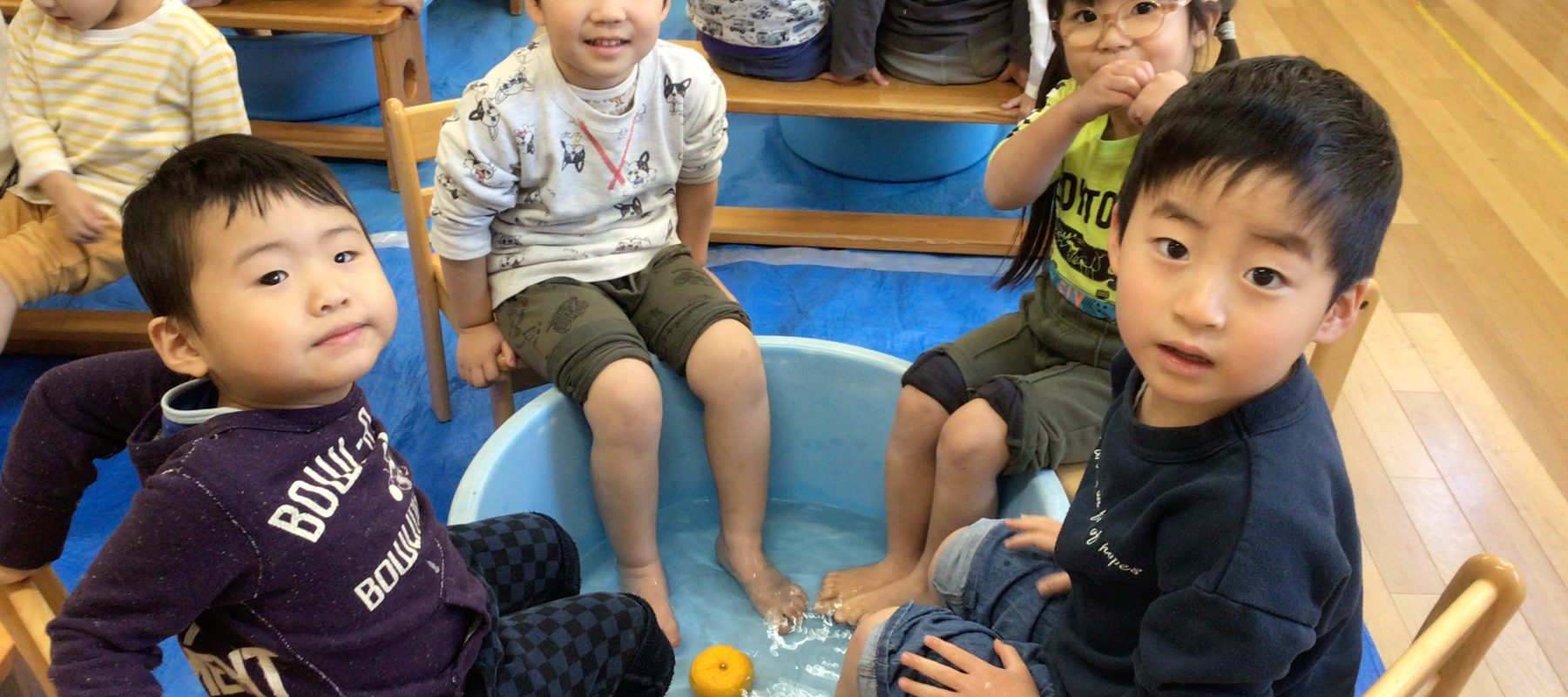 明日は冬至。今日は、柚子湯で足湯をしました。柚子の良い香りの中、温かい足湯でぽっかぽかになりました。“冬至は一年で一番日が短い日”という事も子どもたちに伝え、冬至についてを栄養士から教えてもらいました。