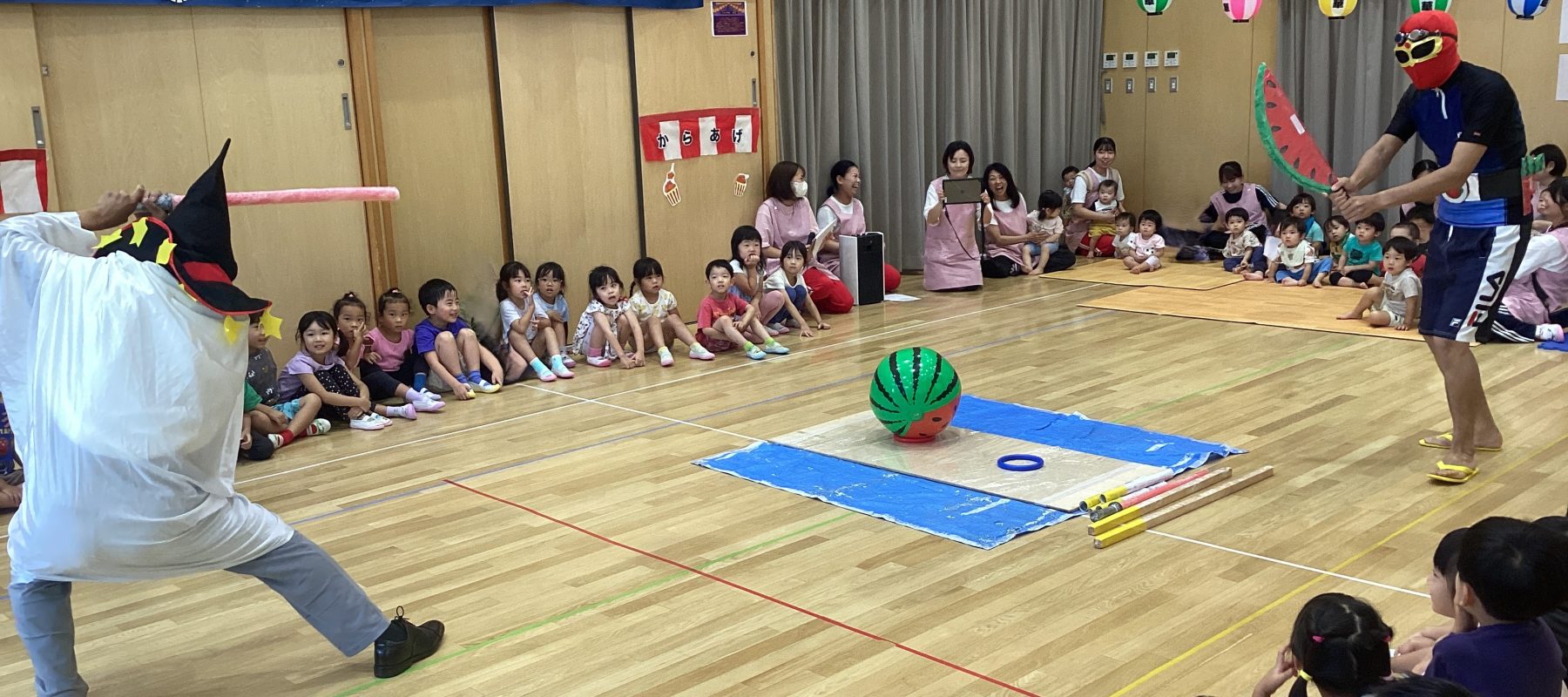 スイカ割で割るスイカがおばけマンに盗まれてしまいました!さぁどうやって取り返そうかと子どもたち達と考えていると…そこにスイカマンが参上!!「スイカマン!子どもたちとスイカを守ってーーー!!」会場のホールは、応援の声で大盛り上がりでした。その後は、おもいっきりスイカ割を楽しみ、5歳児のひまわり組さんが目隠しをしながらもスイカにヒット☆おいしく甘いスイカを味わいました。