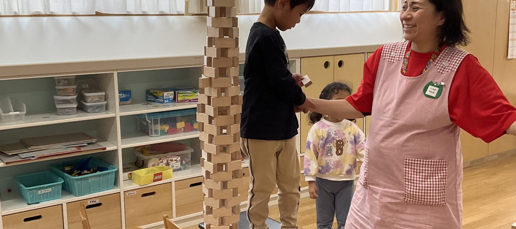 数名が多目的ホールにでるとスケーラといって積み木を重ねていく間に入れることで安定する板を子ども達が自ら持ってきて、秘密基地を作って友だちとごっこ遊びを楽しみました。また、室内では崩れてしまったタワーをより高く作ることに挑戦していました。 高くする積み方にも工夫が見られ、最初は縦向きに積んでいた子どもたちでしたがすぐ崩れてしまい「どうやったら高く積めるだろう…」と考え横向きにしたり、交互に積んだりと様々な積み方を試し、最後はレンガのように積む「レンガ積み」のタワーが1番高くなりました。