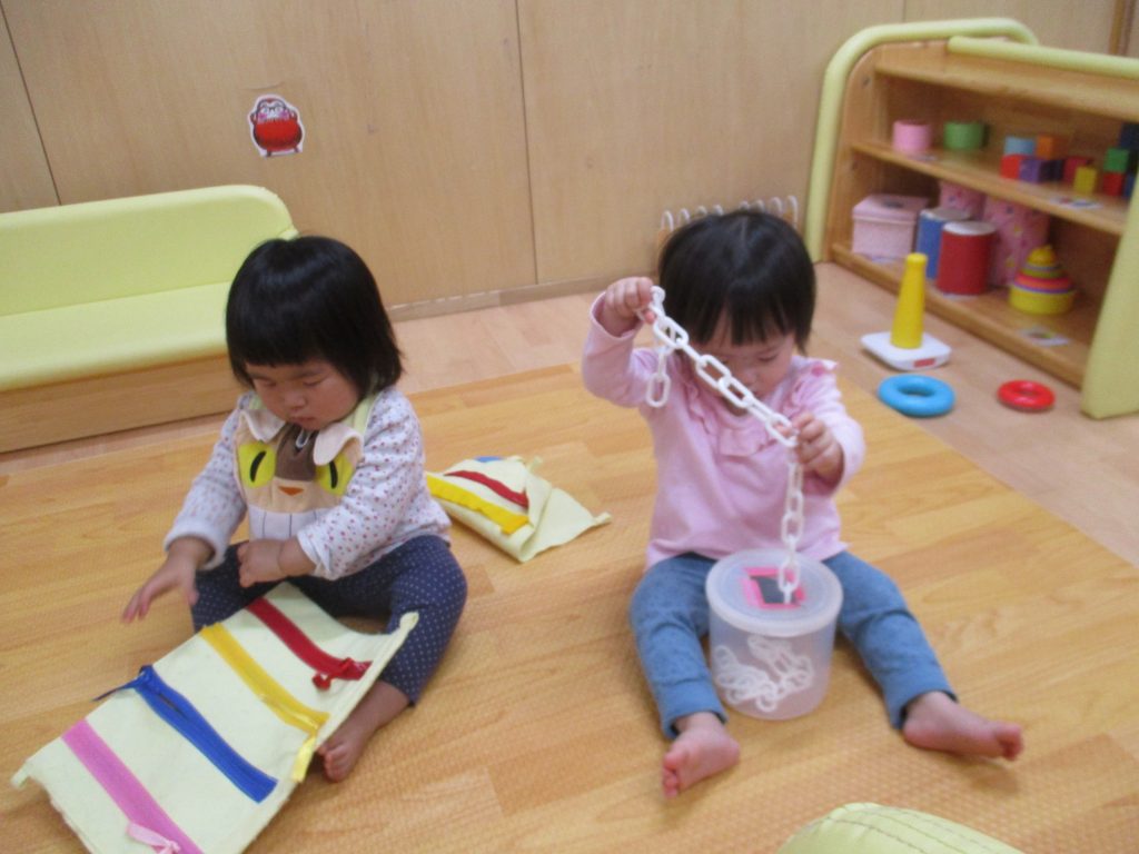 0歳児つくし組の場面です。夢中になりファスナーの上げ下げ。ポットン落としのレベルアップバージョン。どれも保育士の手作りおもちゃです。「楽しんでもらえるかな?」「遊んでくれるかな?」と子どもたちの事を想い、作ってくれています。こんなに夢中になって遊んでくれたら保育士も嬉しいです。きっと「次は何を作ろうかな」と考えているはずです。購入したものだけでなく、保育士の想いがたくさん詰まったおもちゃは、子どもも保育士も笑顔になります。