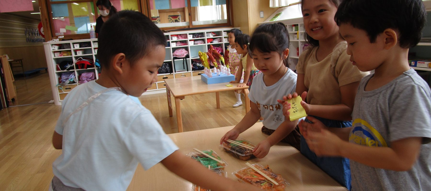 売り手と買い手、それぞれに分かれておいしそうな「チョコバナナ、焼きそば、かき氷」等々縁日のように手作り「お店屋さん」が完成です。魚を大量に釣り、輪投げもを投げる姿は、プロ級でした。今度は違うクラスにも遊びに来てもらいます。