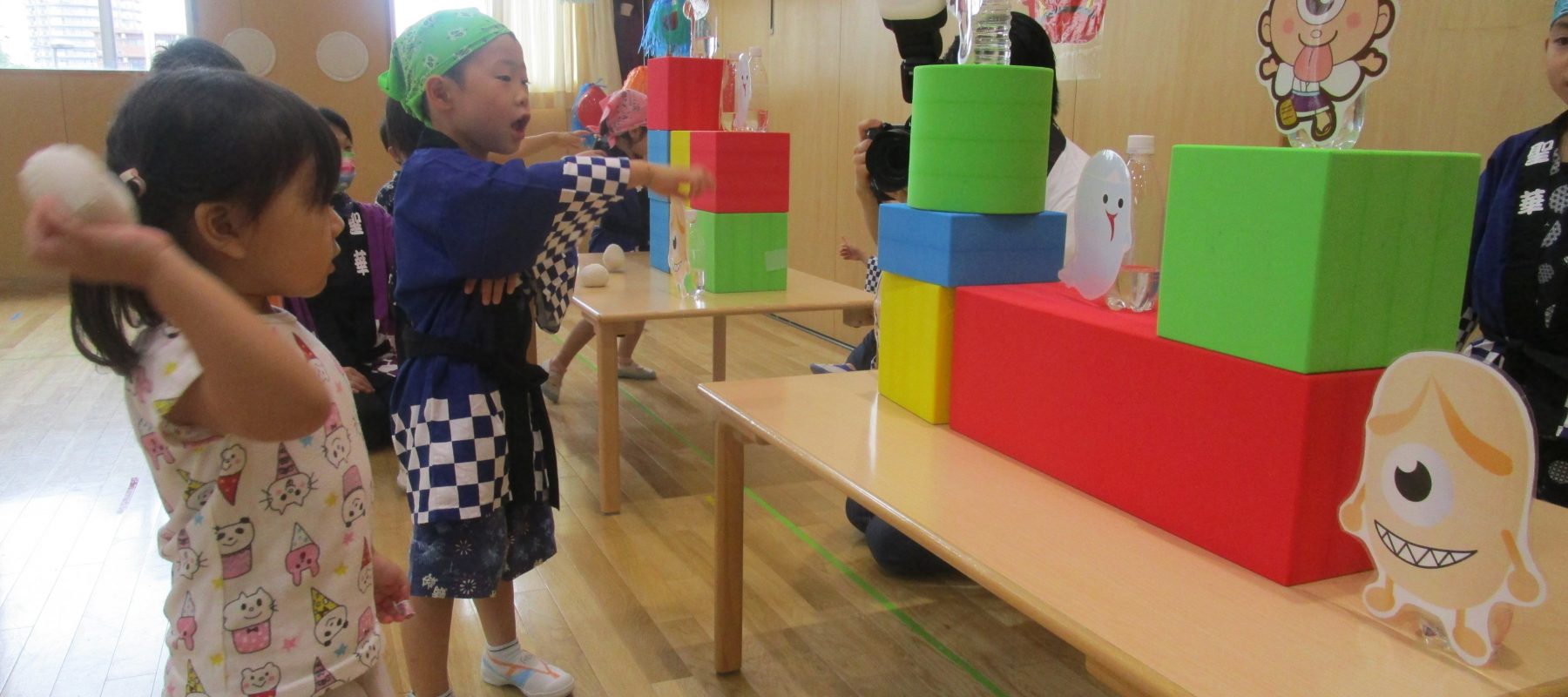 「わっしょい‼わっしょい‼」年長クラスがお神輿をかつぎ、気合の入った掛け声でお祭りごっこが始まりました。魚釣り・輪投げ・的当てにジューズ屋さんと子どもたちは目をキラキラさせながらお祭りに参加していまし