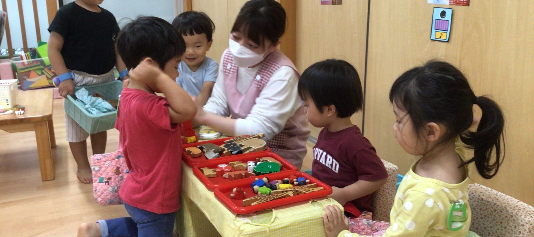 2歳児たんぽぽ組では、お店屋さんが開店しています。「いらっしゃいませ!」と保育士と一緒に元気な掛け声に、たくさんのお客さんが集まります。