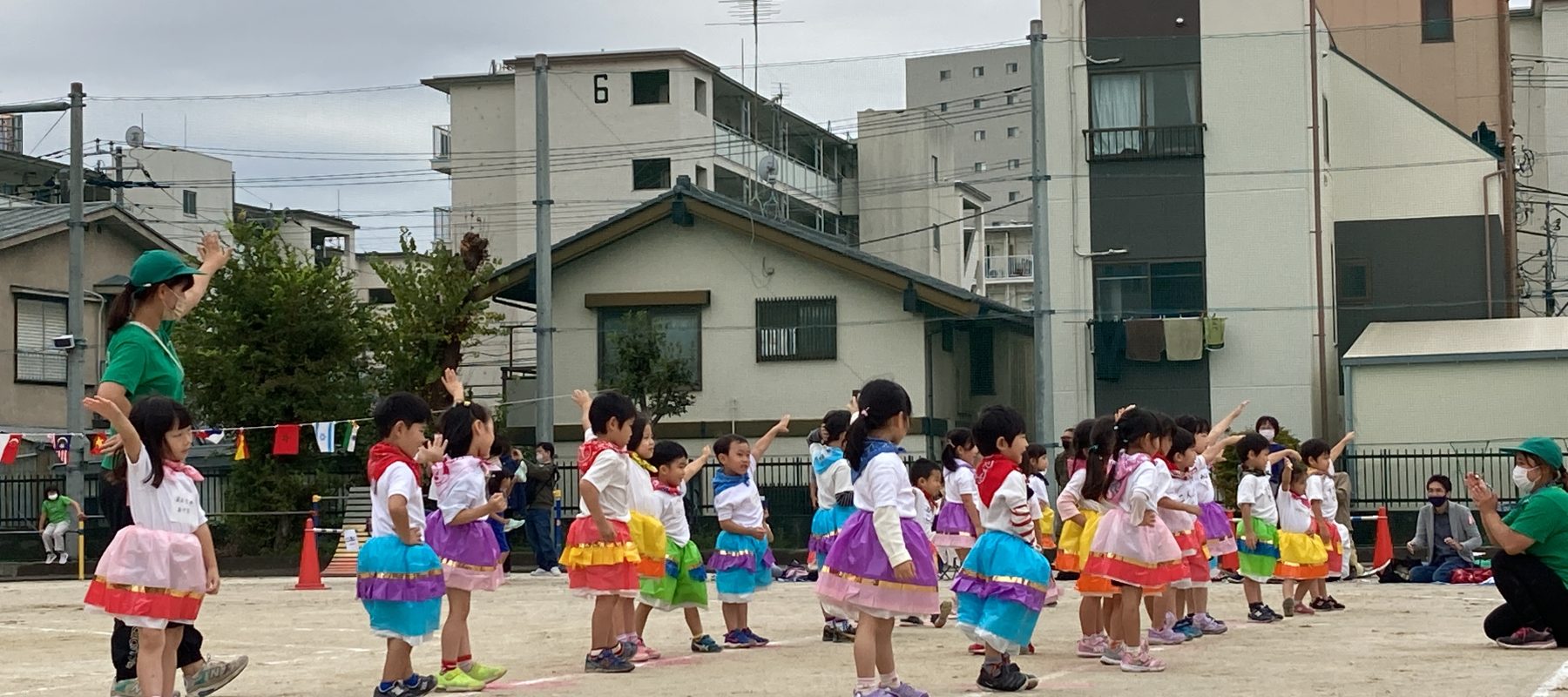 隣の北砂小学校の校庭をお借りして、運動会を開催しました。雨予報でしたが雨も降らず、広い校庭でおもいっきりかけっこやリレー、各種目に挑戦しました。5歳児の大山登りやリレーでは、3・4歳の保護者の方も手に汗を握りながら一緒に応援をして頂き、会場が1つになりました。