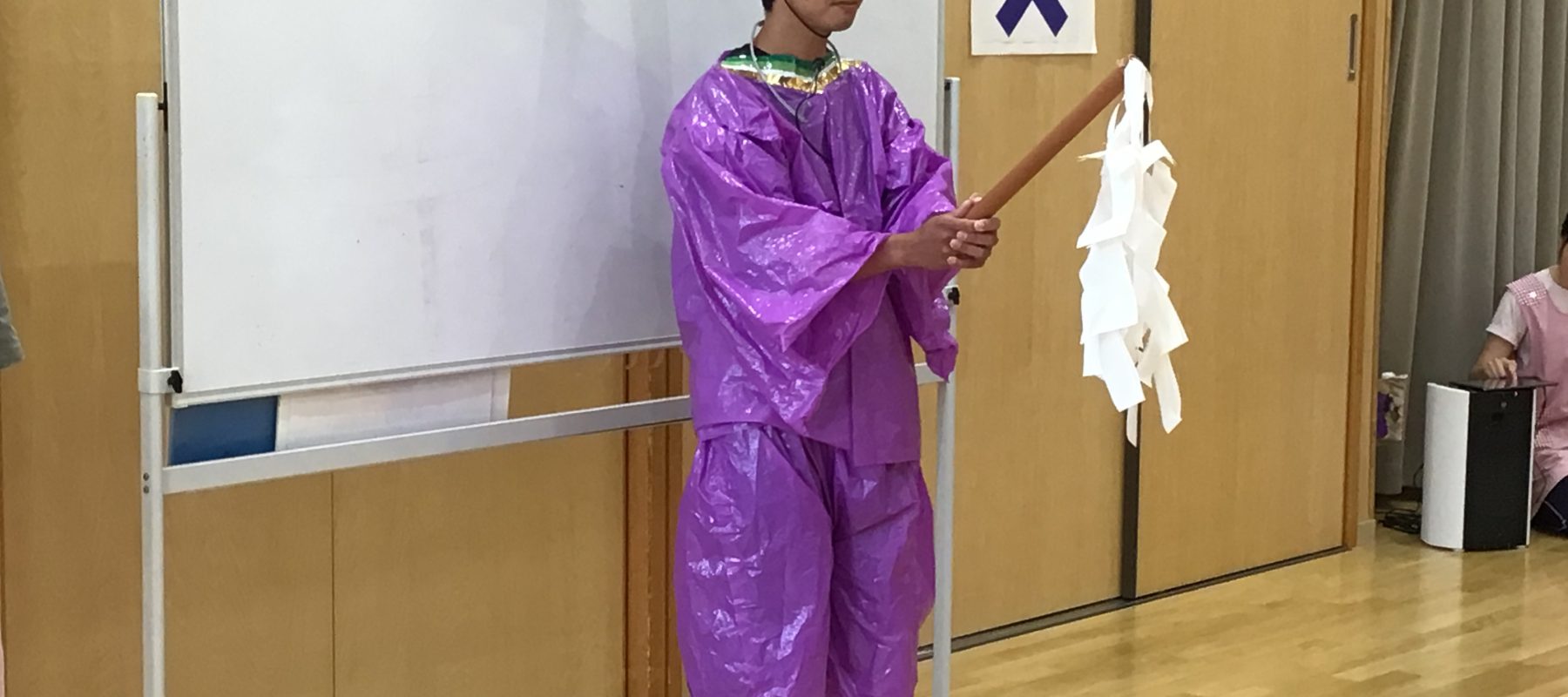 待ちに待った夏がやってきました!今年も、水の神様の使い人“ヤマカミサマ”がやってきて、安全に遊べるよう祈ってくださいました。その後は、プールの時の約束事項を確認しました。今年の夏も熱くなるので、楽しく安全に気持ちよく遊びたいと思います!!